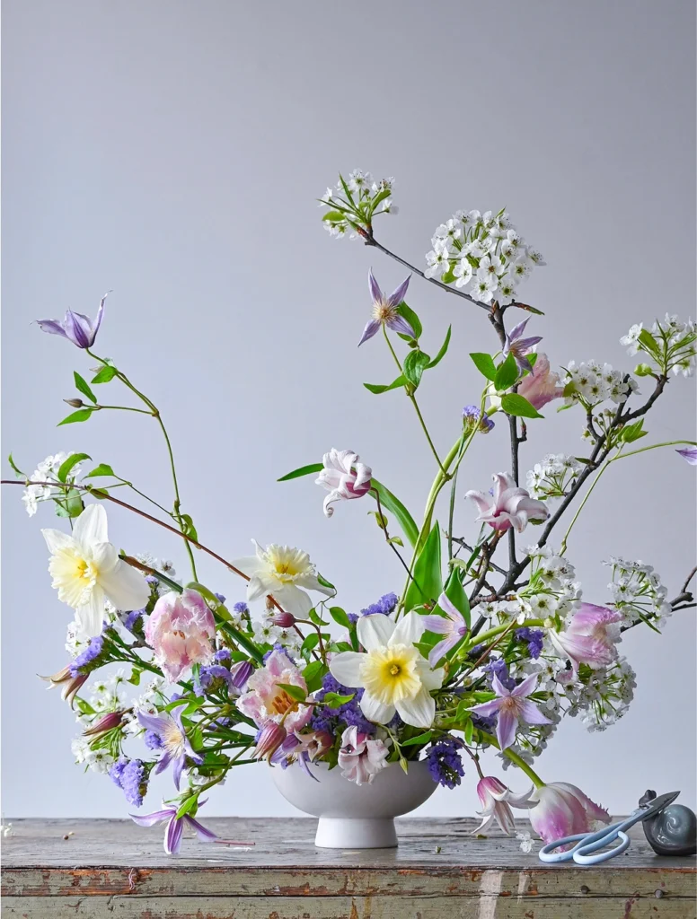 Sí, siempre que puedo uso alambre y evito la espuma floral. Solo la uso si no hay otra opción, pero prefiero trabajar con agua. No solo es mejor para el medio ambiente, sino que a las flores les gusta más el agua. Con la espuma, una vez que haces un agujero, empieza a descomponerse y eso crea toda una serie de problemas. Creo que es genial que haya espacios donde se discutan estas técnicas. Y creo que si alguien está empezando y aprende a trabajar sin espuma desde el principio, le irá mucho mejor. A veces, la gente que empieza con espuma viene a mis clases y les cuesta entender técnicas como las ranas de alfiler o el uso de alambre porque todo se mueve. Y sí, se mueve, pero eso es parte de ello, y esa es la belleza. Si una flor no quiere estar en un sitio determinado, déjala ir. Me encanta la idea de que las flores tengan personalidad propia.