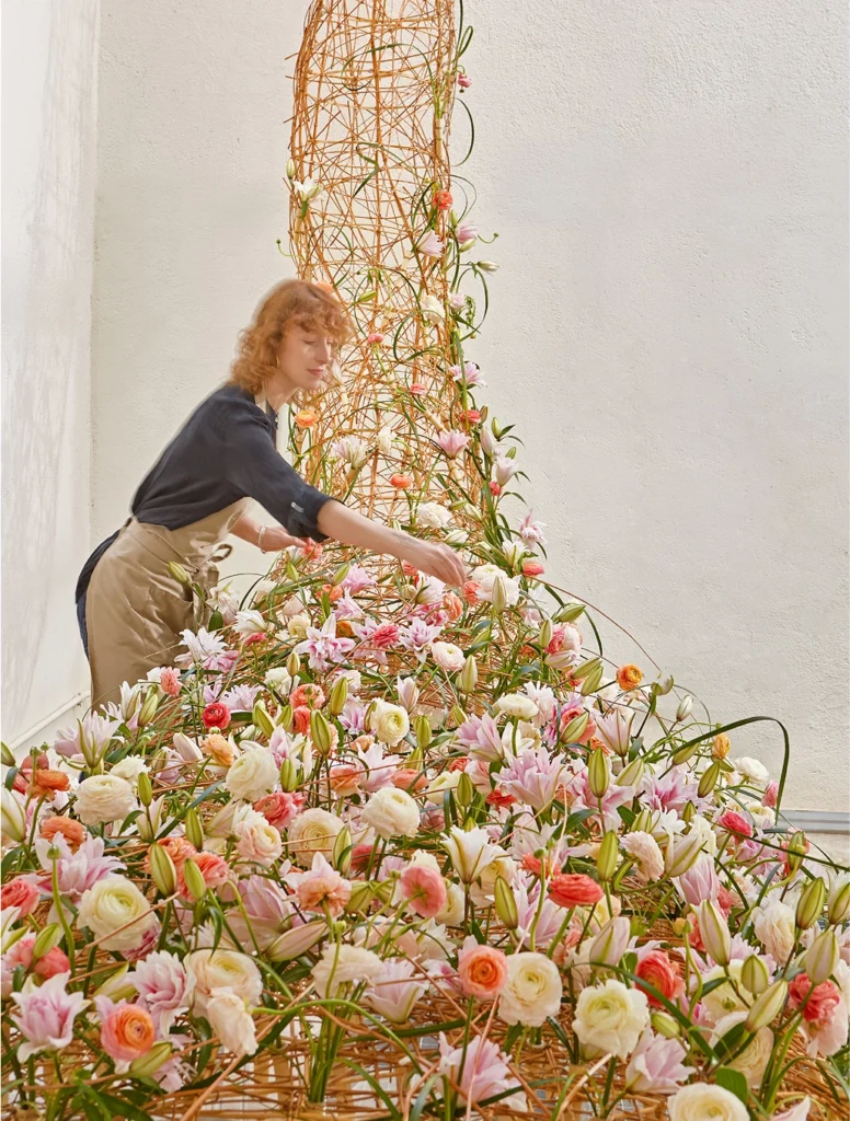 Es difícil reducir mi estilo a una sola definición, ya que ha evolucionado con el tiempo. El diseño floral se ve influenciado por tendencias cambiantes y movimientos globales, incluso megatendencias que impactan en muchas disciplinas, incluyendo las artes. Mi trabajo se inclina hacia la sostenibilidad y los enfoques orgánicos, utilizando materiales vegetales y naturales. Combino estilos clásicos y modernos, simétricos y asimétricos, vegetativos y naturalistas, pero rara vez algo opulento. Esta estética también está moldeada por mi larga experiencia enseñando diseño floral avanzado. Muchos reconocen una fuerte presencia estructural en mi trabajo, cimientos complejos y construcciones detalladas. A menudo encuentro inspiración en las bellas artes, especialmente en Marc Chagall, cuyas pinturas me han inspirado a crear obras florales que parecen flotar en el aire. Busco evocar esa sensación de asombro infantil, la forma en que los niños siguen algo en el aire con los ojos, la boca ligeramente abierta por el asombro. Ese es un sentimiento que nunca debemos perder.