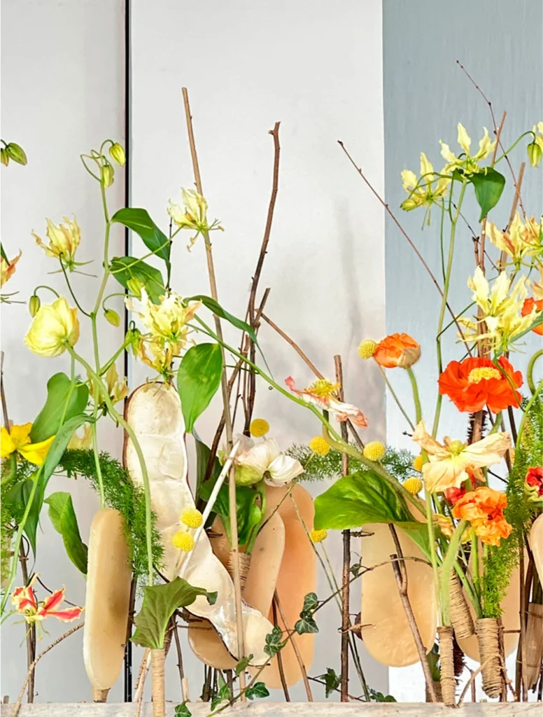Los espacios de aprendizaje nos permiten explorar aspectos esenciales del diseño, como el estudio de la forma, la simetría y la asimetría, el ritmo y el movimiento, las secuencias espaciales, la teoría del color, la textura, el contraste, las técnicas estructurales y el conocimiento botánico. También trabajamos la comunicación visual mediante el boceto, la mezcla y la creación de colores, y la aplicación de estas combinaciones de color y textura a las composiciones florales. Estas áreas de estudio son diversas, pero a menudo están interconectadas y enriquecen enormemente nuestra comprensión y práctica del diseño floral.