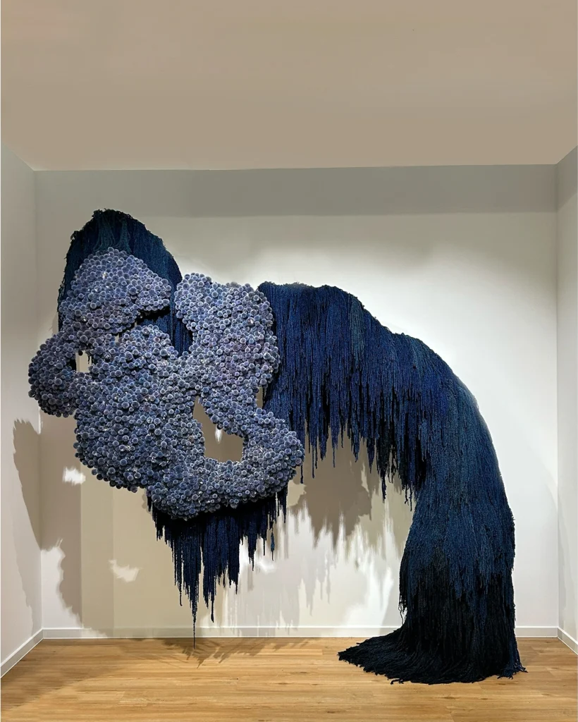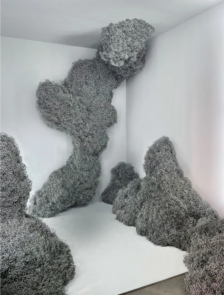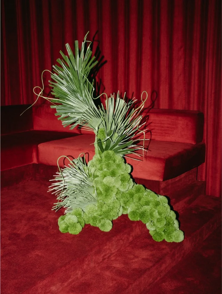 Pienso de manera muy diferente a otras instalaciones florales. Me interesa mucho la sensación intermedia, preguntándome qué es esto, una sensación de inquietud, una sensación de incomodidad porque no se puede discernir qué está pasando. ¿Qué estoy viendo? Así que pienso en esa sensación intermedia, explorándola. Porque siento que, especialmente para mi exposición del año pasado, por supuesto, vino mucha gente y hubo muchas reacciones diferentes. Muchas reacciones fueron como: «Ay, quiero abrazar esa escultura». Y otra fue como: «Ay, pero esta escultura me incomoda mucho». Así que creo que siempre se trata de jugar con ese contraste entre la suavidad y, de nuevo, la sensación de incomodidad.