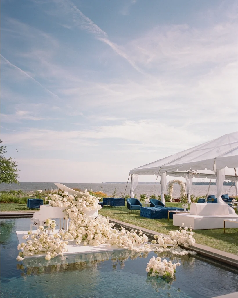 Siento que tengo mucha más confianza. Lo curioso es que he dejado de lado ciertos detalles. Y con eso quiero decir que no es que no les preste atención. Quiero decir que a veces realmente necesitas ver el panorama general cuando estás diseñando, porque tienes un plan y existe una realidad. Y la realidad dicta cómo deben ir las cosas. Por ejemplo, tuvimos una boda hace unas semanas. Era un diseño precioso en el agua, pero el viento era terrible. No pudimos hacer ni el 25% de los diseños. Así que lo dejamos todo en tierra. Todo el plan tuvo que cambiar, y tuvimos que mantener la calma y la serenidad, simplemente idear soluciones alternativas, no estancarnos en los detalles y tener en cuenta el panorama general. Por ejemplo, ¿cuál es la experiencia que le prometimos al cliente? ¿Cómo podemos crearla aunque el viento nos lo esté robando todo? Al principio de mi carrera, puede que me hubiera hecho llorar. Pero ahora, siento que, pase lo que pase, siempre salimos adelante. El cliente está contento y nadie sabe que, en realidad, estamos en el plan Z más uno. Así que diría que lo más importante ha sido aprender a ajustar, adaptar, cambiar sobre la marcha y resolverlo.