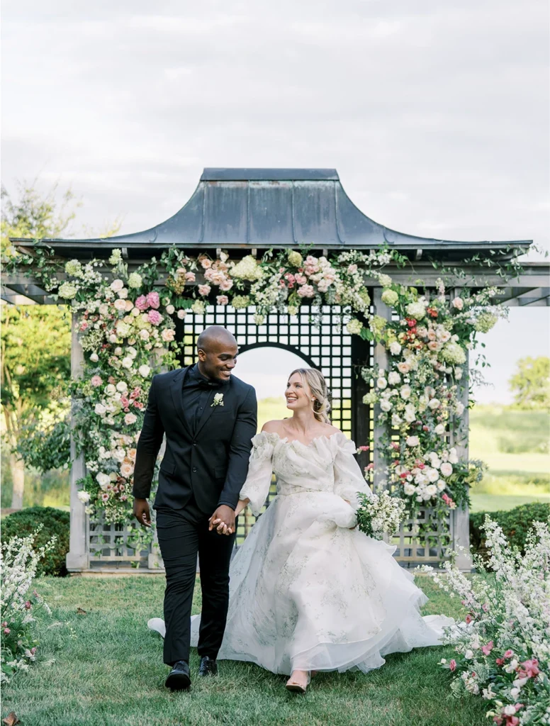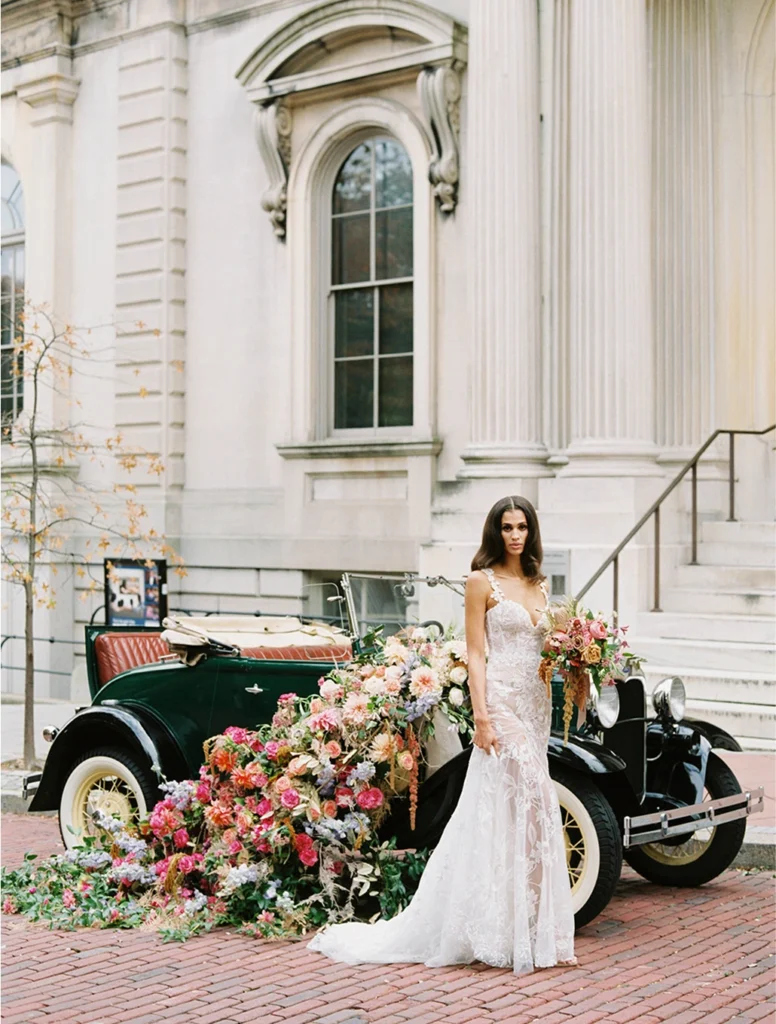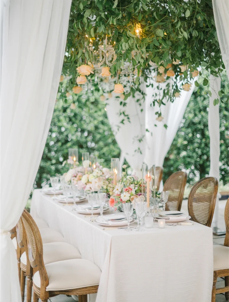 Viene en muchísimas formas y tamaños diferentes. A veces es el lugar. A veces es una foto. Puede ser completamente aleatorio. Puede ser solo un color, o un trozo de lino, una tela preciosa, y empiezas a analizarla en términos de movimiento, color y textura. Simplemente construyes todo el evento en torno a eso. No se trata solo de flores. Se trata de crear una experiencia. Y a veces las flores son una parte importante, pero a veces yo sería la primera en decir: «Usemos menos flores. Usemos mantelería porque nos ayudará a contar la historia». Si tienes un precioso centro de mesa de 350 dólares y lo colocas sobre una tela de poliéster transparente, no hay nada que pueda hacer para que esas flores se vean bonitas. Se ven fuera de lugar. Lo arruinan todo. Pero si tienes una hermosa tela, detalles bien pensados en la decoración de la mesa, le añades algunos toques florales y luce espectacular. Se trata de ver el panorama general y preguntarse: ¿funcionan estos elementos juntos? ¿O necesitamos cambiar las cosas? O si tu diseño final es un poco sombrío y oscuro, lo que sea, veamos cómo podemos permitirnos una buena iluminación. ¿De qué sirve invertir dinero si no vas a obtener el resultado final como debería?
